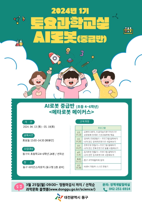 강좌 신청은 이달 25일부터 ‘동구 과학문화체험 웹페이지’에서 선착순으로 할 수 있으며, 초급반(1~3학년) 및 중급반(4~6학년) 각 24명씩 모집한다.