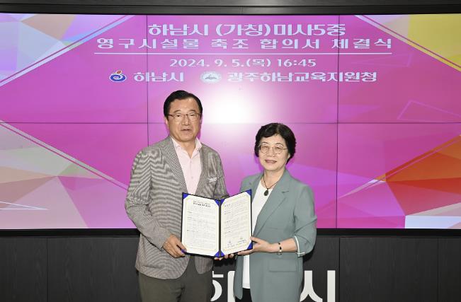 [뉴스서울] 하남시는 5일 하남시청에서 광주하남교육지원청(교육장 오성애)과 ‘(가칭)미사5중 신설을 위한 영구시설물 축조 합의서’를 체결했다고 밝혔다.