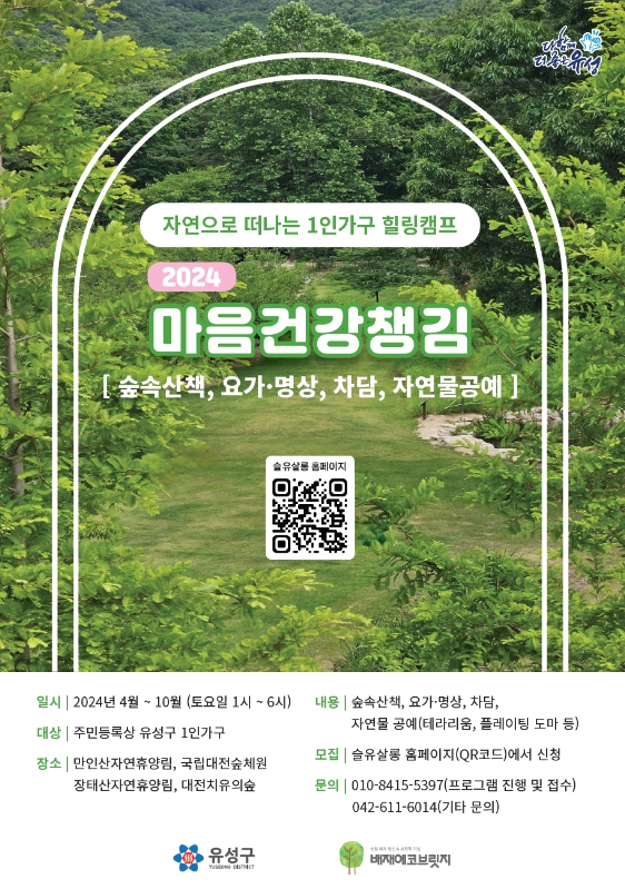 [뉴스서울] 대전 유성구가 4월부터 10월까지 1인가구 숲속 힐링캠프 '마음건강챙김'사업을 추진한다.