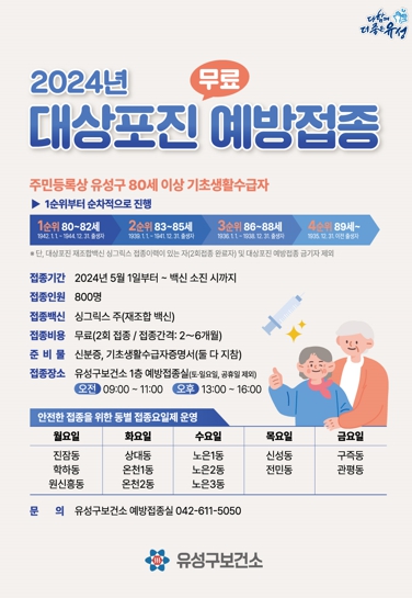 [뉴스서울] 대전 유성구가 80세 이상 기초생활수급자의 건강보호 및 경제적·사회적 비용절감을 위해 대상포진 무료 예방접종을 지원한다.