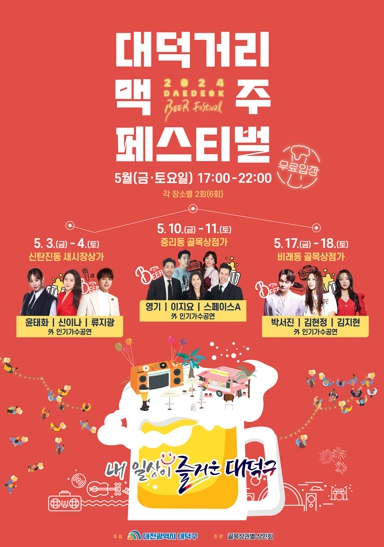 2024 대덕거리 맥주페스티벌은 △5월 3~4일 신탄진동 신탄새시장상점가 △5월 10~11일 중리동 중리행복길 △5월 17~18일 비래동 비래동골목형상점가에서 총 6회에 걸쳐 개최할 예정이다.