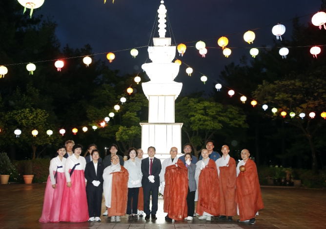 이날 찬불가 음성공양을 시작으로, 삼귀의와 반야심경 봉독, 축사, 봉축법어, 발원문 낭독, 봉축탑 점등, 탑돌이, 사홍서원 등이 진행됐다.