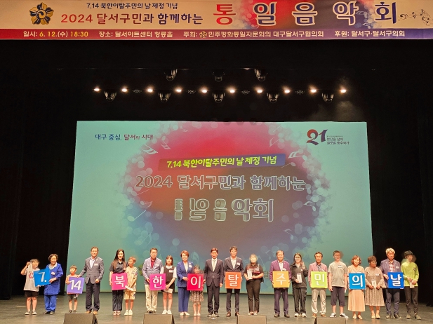 [뉴스서울] 민주평화통일자문회의 대구달서구협의회는 6.12 18:30 달서아트센터 청룡홀에서 “2024 달서구민과 함께하는 통일음악회” 를 개최했다. 이미영 민주평통달서구협의회장, 이태훈 달서구청장, 김해철 달서구의회의장 등을 비롯한 북한이탈주민과 지역주민, 자문위원, 500여명이 참석했으며, 7월 14일 북한이탈주민의 날 국가기념일 제정을 기념하여 탈북민 자녀 통일장학금 전달 및 퍼포먼스를 통해 자유통일을 향한 소통과 공감의 시간으로 채워졌다.