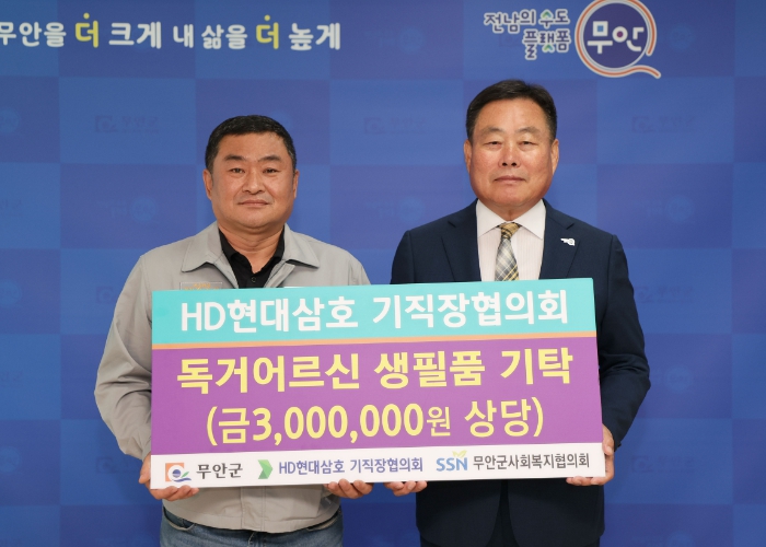 [뉴스서울] 전남 무안군은 지난 16일 HD현대삼호 기직장협의회가 독거어르신을 위하여 300만원 상당의 생필품을 기탁했다고 밝혔다.