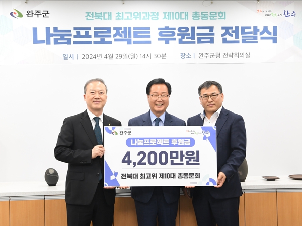 유희태 완주군수는 “큰 나눔을 기꺼이 해주신 전북대 최고위과정 제10대 총동문회에 진심으로 감사의 말씀을 전한다”며 “성금은 기탁해 주신 뜻에 따라 잘 쓰이도록 하겠다”고 인사를 전했다.