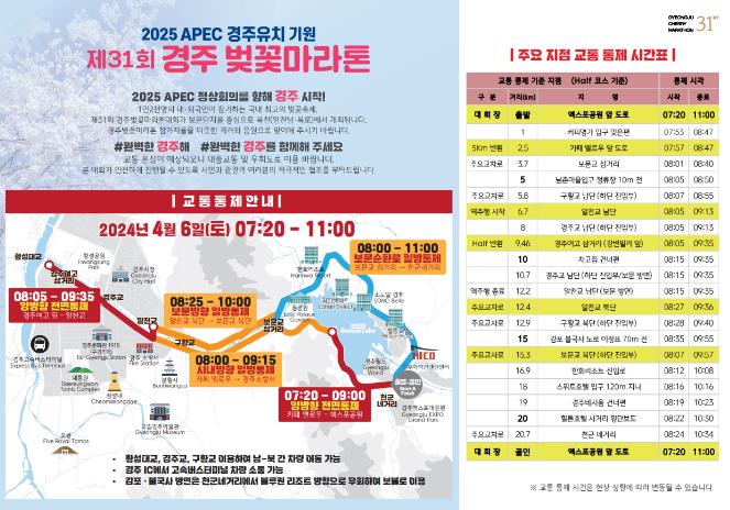 | ▲ 제31회 경주벚꽃마라톤 주요 구간 교통통제 시간표 |