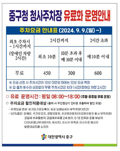 [뉴스서울] 대전 중구는 청사 방문 목적 이외의 장기 주차 등으로 주차 공간이 부족하여 발생하는 민원을 해소하고 민원인들의 주차편의를 제공하고자 구청사 부설주차장 요금을 인상한다고 밝혔다.
