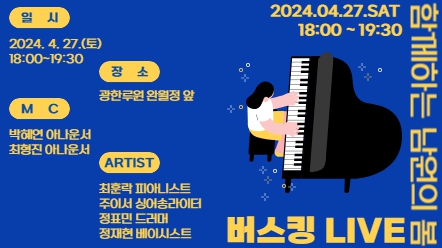 봄을 맞이해 예술로 피어나는 남원 곳곳 다양한 문화 행사들이 펼쳐지는 가운데 이번 버스킹 공연은 남원시 홍보대사 박혜연 아나운서와 최훈락 피아니스트, 싱어송라이터 등 아티스트와 함께 다양한 연주곡들을 감상할 수 있다.
