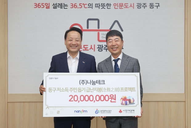 [뉴스서울] 광주 동구는 29일 오전 ㈜나눔테크(대표 최무진)가 관내 어려운 이웃에 도움을 주고 싶다며 2천만 원을 기탁했다고 밝혔다.