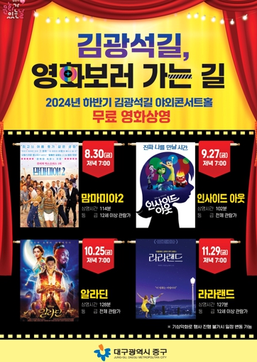 김광석길 영화관은 이달 30일 그리스의 시원한 배경을 보며 늦여름의 무더위를 잠시나마 잊을 수 있는 영화 ‘맘마미아2’ 상영을 시작으로 ▲9월 ’인사이드 아웃‘▲10월 ’알라딘‘ ▲11월 ’라라랜드‘까지 매달 테마를 정해 주제에 맞는 다양한 영화를 무료로 상영한다.
