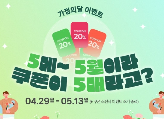 이번 행사는 오는 5월 14일까지(예산소진시 종료) 진행하며, 소중한 분들에게 행복 듬뿍 담은 선물을 아낌없이 보낼수 있도록 기간 동안 쇼핑몰 전 품목 20% 할인쿠폰(최대 3만원)을 매일 매일 5매씩 지급한다.