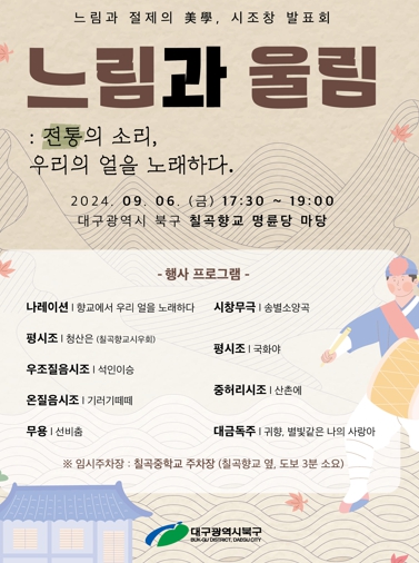 [뉴스서울] 대구 북구청은 오는 9월 6일, 칠곡향교 명륜당 마당에서 ‘시조창 발표회’를 개최한다.