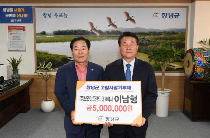 [뉴스서울] 창녕군은 지난 21일, ㈜브라이트랜드 이남형 대표가 창녕군에 고향사랑기부금 개인 최고액인 500만 원을 기탁했다고 밝혔다.