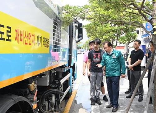 한편, 주석수 연제구청장은 더운 날씨에도 가로 청소에 구슬땀을 흘리고 있는 환경미화원들을 찾아 얼음 생수를 전달하며 야외 근로자들의 노고를 격려했다.