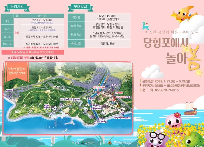 [뉴스서울] 고성문화관광재단은 본격적인 봄나들이 시즌을 맞아 오는 4월 27일부터 5월 19일까지 당항포관광지에서 야외공연, 가족 단위 참여형 행사 등이 어우러진 봄철 행사 ‘당항포에서 놀아봄’을 진행한다고 밝혔다.