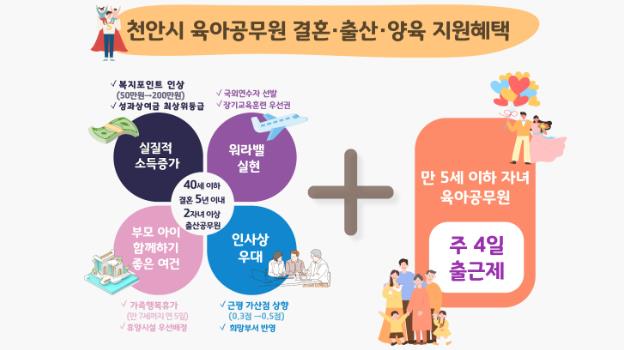 시는 청년층의 결혼·출산 기피 등의 사회 문제가 가속화되고 매년 천안시 평균연령 증가, 합계출산율도 감소됨에 따라 결혼부터 육아까지 아이 낳아 키우기 좋은 공직문화 조성을 위한 다양한 인센티브 제공을 추진한다.