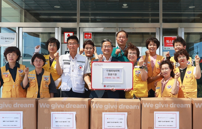 12일 대한적십자사 경상북도지사는 수해민들을 위한 기능성이불 25세트, 김 6박스와 현장복구 인력지원을 위한 장갑 600켤레, 장화 100켤레를 기탁했다.