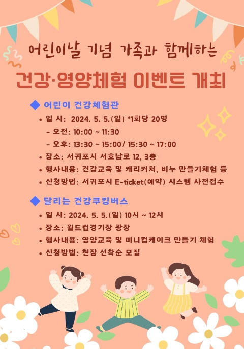 어린이 건강체험관 행사는 오전 1회(10:00), 오후 2회(13:30, 15:30)로 구성되며, 회당 90분 소요된다. 참가인원은 1회당 20명으로, 이달 17일부터 서귀포시 E-ticket(예약) 시스템을 통해 선착순 예약제로 참가신청 가능하다.