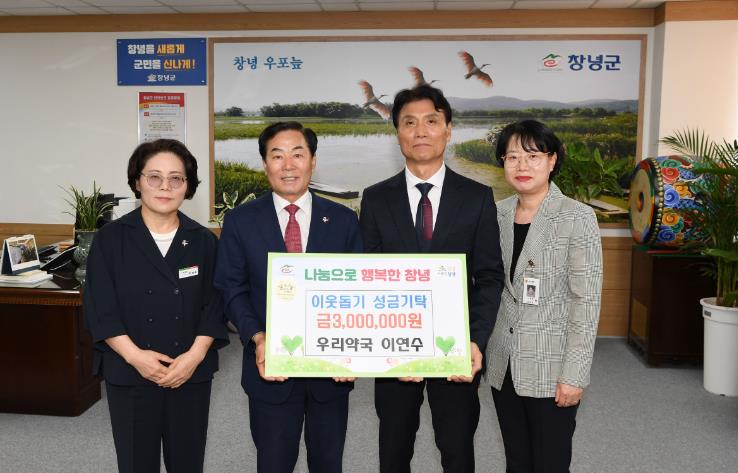 [뉴스서울] 창녕읍 우리약국 대표 이연수 약사는 지난 23일, 도움이 절실한 어려운 이웃에게 전해 달라며 성금 300만 원을 창녕군에 기탁했다.