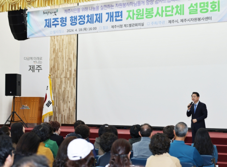 [뉴스서울] 제주시는 4월 18일 시청 제1별관 회의실에서 제주시자원봉사센터에 소속된 자원봉사자 300여 명을 대상으로 ‘제주형 행정체제 개편’ 설명회를 개최했다.