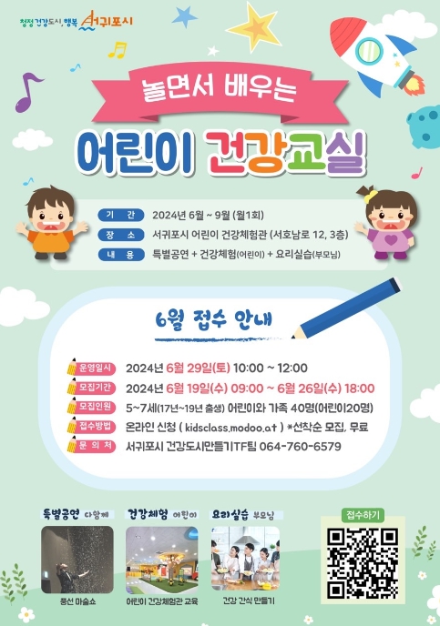 [뉴스서울] 서귀포시는 어린이들의 건강한 생활습관 형성을 위해 오는 6월 29일 토요일 어린이 건강체험관에서‘놀면서 배우는 어린이 건강교실’프로그램을 개설하고 19일부터 가족단위 참가자를 선착순 모집한다.