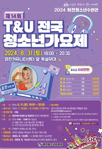 화천군은 오는 31일 오후 6시, 화천커뮤니티센터 앞 야외 특설무대에서 ‘2024 화천청소년수련관 제14회 T&U 전국청소년가요제’를 개최한다.