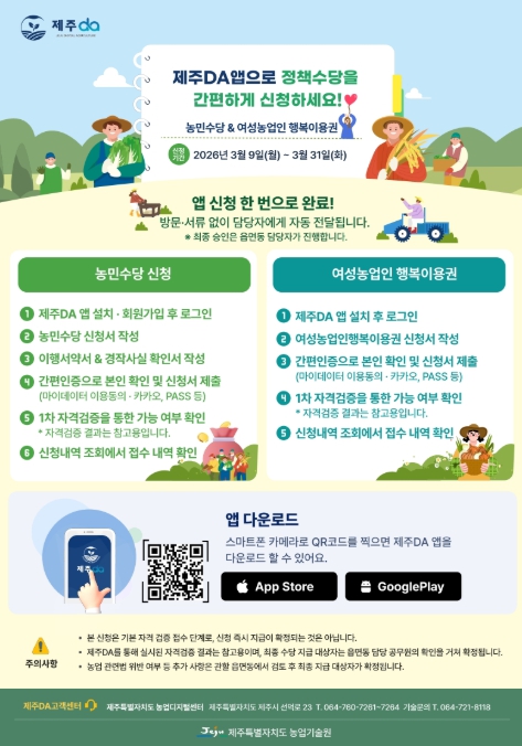 농민수당 및 여성농업인 행복이용권 지원사업 신청기간은 3월 31일까지이며, 제주DA 앱을 통한 비대면 신청 서비스는 3월 9일 시범 운영을 시작해 공공 마이데이터 서비스 승인 절차를 거쳐 3월 16일부터 정식 운영할 예정이다.