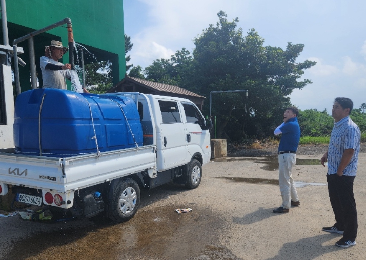 지난 6일 구좌읍에 공용 이동식 물탱크(물빽) 6개소(120톤) 설치와 함께 급수차량(구좌읍, 농어촌공사, 농협 및 임차차량 등)을 이용한 농업용수 공급(800톤)으로 초기 농작물 피해 최소화를 위해 주력하고 있다.