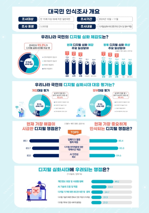 국민 93.3%가 한국 사회가 디지털 심화시대에 있다고 인식했으며, 52.2%는 자신이 디지털 심화에 효과적으로 대응한다고 평가했고 정부가 효과적으로 대응했다는 응답은 49.9%로 개인보다 소폭 낮게 집계됐다.