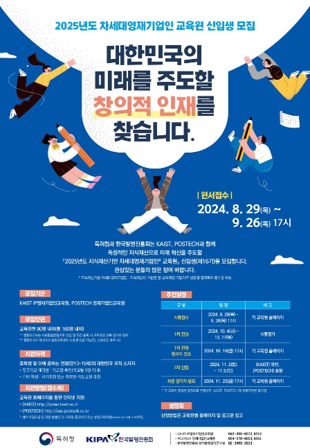 [뉴스서울] 특허청은 카이스트(KAIST), 포스텍(POSTECH)과 함께 8월 29일~9월 26일 17시까지 '2025년도 지식재산기반 차세대영재기업인 교육원' 신입생(제16기)을 모집한다.