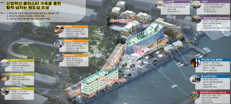 이번 혁신지구 공모에서 최종 선정된 2곳은 인천 동구 화수부두 일원과 서울 구로구 가리봉동 일원으로 세부 사업계획은 먼저 인천 화수부두 일원은 기업 이전 등으로 급격히 쇠퇴하여 노후 공장과 노후주택, 어시장 등이 자리하고 있는 지역으로, 도시재생사업을 통해 복합거점시설을 조성하여 일자리를 창출하는 한편, 지역 내 근로자·원주민 등을 위한 주거·복지환경도 개선한다는 계획이다.