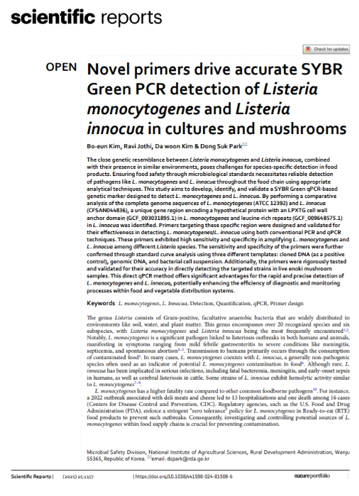 [뉴스서울] 농촌진흥청은 대표적인 식중독균 ‘리스테리아 모노사이토제네스’를 신속 정밀하게 진단할 수 있는 기술을 개발하고, 그 결과를 국제학술지에 논문으로 게재했다.
