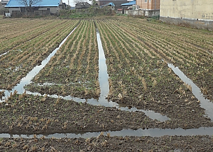 (물 빠짐 관리) 물 빠짐이 나빠 겨울나기 중 땅이 녹았다 얼기를 반복하면 서릿발이 솟구치면서 뿌리가 얼거나 끊길 수 있다. 뿌리에 산소가 부족할 경우 잎이 노랗게 변하며 말라 죽는 습해 피해가 발생할 수 있다. 습해 및 서릿발 피해가 발생하지 않도록 물 빠짐 길(배수로)과 물빼기 도랑(배수구)을 정비한다. 물 빠짐이 불량한 논에서는 무굴착 땅속배수 기술을 적용해 토양수분과 지하수위를 낮추면 습해를 줄일 수 있다. 한편, 밀 생육을 위한 적정 토양수분은 최대용수량의 60∼70%, 토양공극률은 30∼35% 이상이다.