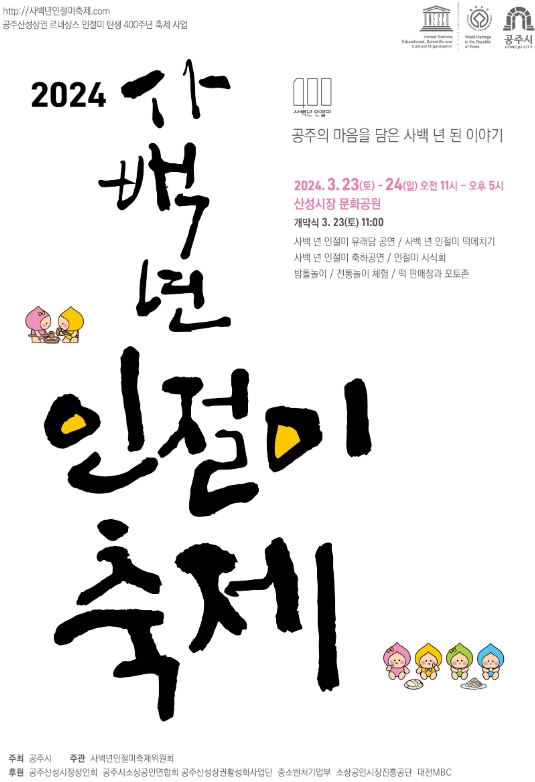 15일 공주시에 따르면, 공주의 마음을 담은 사백 년 된 이야기 ‘2024 사백년 인절미 축제’가 오는 23일과 24일 양일간 산성시장 문화공원에서 개최된다.