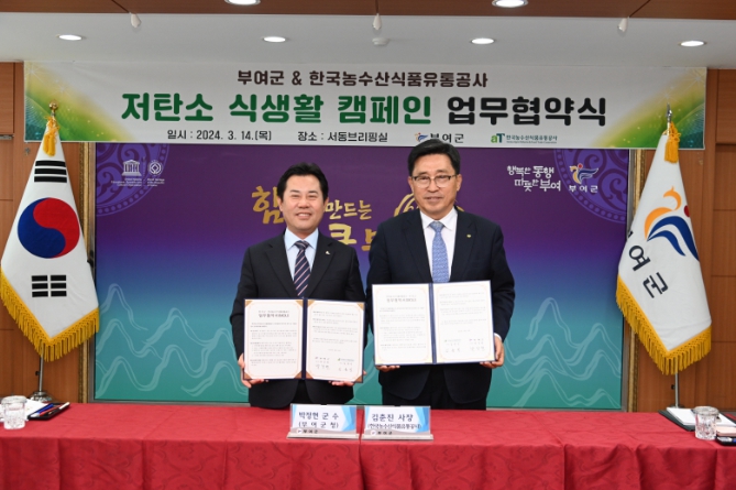 [뉴스서울] 부여군은 지난 14일 부여군청 서동브리핑실에서 한국농수산식품유통공사와 저탄소 식생활 문화확산과 지역경제 활성화를 위한 업무협약을 체결했다고 15일 밝혔다.