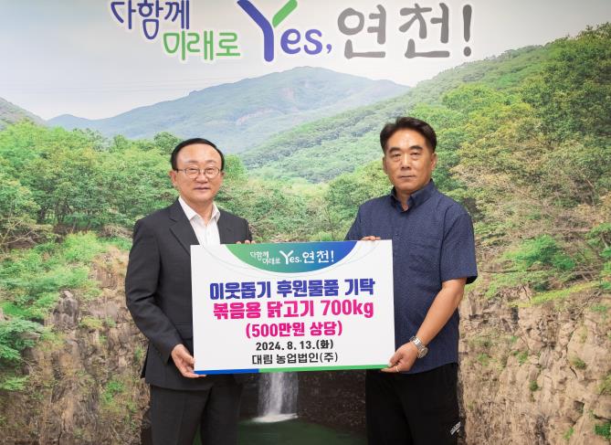 [뉴스서울] 연천군은 13일 대림농업법인 주식회사 김만준 대표가 연천군청을 방문해 관내 취약계층 지원을 위한 후원물품 볶음용 닭고기 700kg(500만원 상당)를 연천군에 기탁했다고 밝혔다.