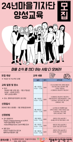 개강은 4월 12일이며, 매주 금요일 행복의성지원센터 (의성군 의성읍 문소2길 24)에서 진행될 예정이다.