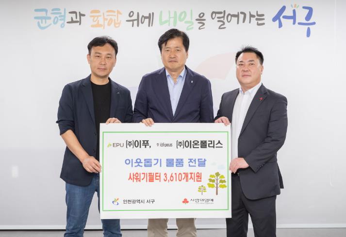 [뉴스서울] 인천 서구는 8월 13일 ㈜이푸(대표이사 김재준), ㈜이온폴리스로부터 이웃사랑 물품(샤워기필터) 3,610개를 기탁받았다.