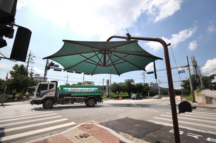 특히 유동 인구가 많은 주요 횡단보도, 도로변 등에는 보행자가 햇볕을 피할 수 있도록 그늘막 16개소가 설치되어 운영 중이다.