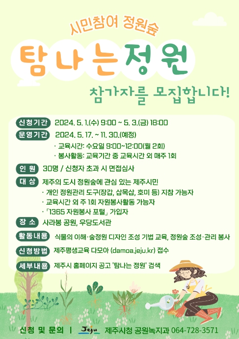 모집인원은 30명이며 인원 초과 시 면접을 통해 참여자를 선발할 예정이며, 선발 대상자는 5월 17일부터 11월 30일까지 월 2회 정원숲 교육과 교육시간 외 매주 1회 봉사활동을 진행하게 된다.