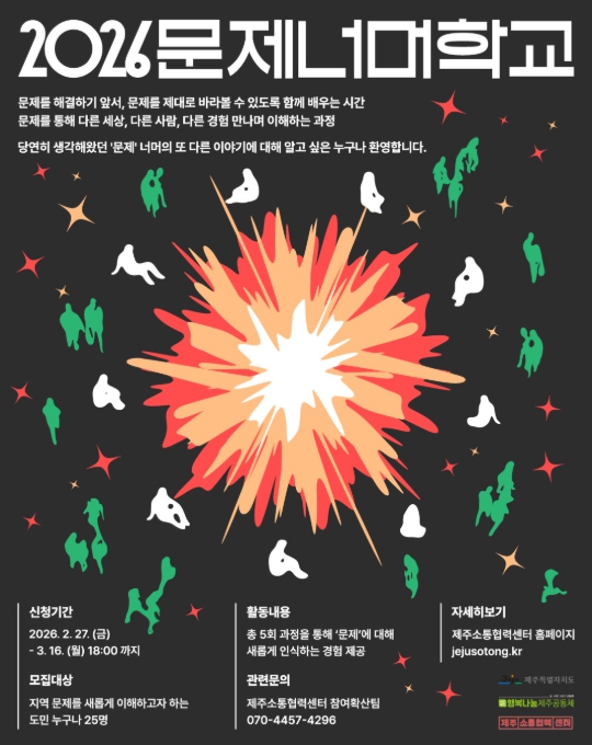 [뉴스서울] 제주특별자치도와 제주특별자치도 소통협력센터가 도민 주도의 지역문제 탐구를 지원하는 교육 프로그램 ‘2026 문제너머학교’를 운영하고, 27일부터 3월 16일까지 참여자를 선착순으로 모집한다.