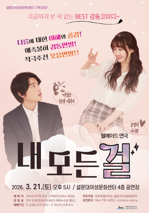 [뉴스서울] 제주특별자치도 설문대여성문화센터는 3월 21일 오후 5시 센터 4층 공연장에서 ‘설문대 문화의 날’ 3월 기획공연으로 연극 ‘내 모든 걸’을 선보인다고 밝혔다.
