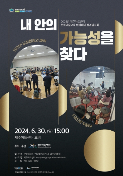 제주아트센터는 상반기 문화예술교육 아카데미로 ‘드럼으로 두둥탁!’과 ‘브라보! 남성합창의 매력’ 2개 과정을 운영했고, 아카데미 과정에 참여한 수강생들은 교육 기간 동안 갈고닦은 역량을 이번 기획공연을 통해 발표한다.