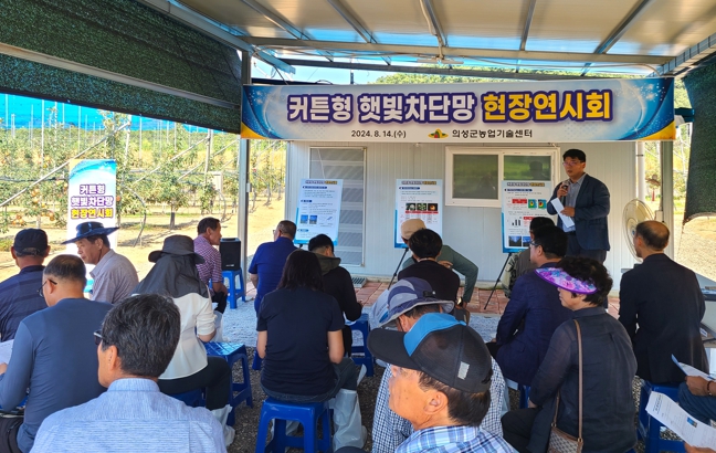 [뉴스서울] 의성군은 14일 고온기 사과 일소피해 방지를 위한 햇빛차단망 시범사업 현장연시회를 개최했다.