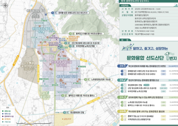 완주일반산업단지 : ‘일하고, 즐기고, 성장하는 문화융합 선도산단 1번지’가 비전이다. 완주산단의 역사(농업, 자동차, 수소)를 홍보하고 산단 내 자동차산업과 수소산업을 체험할 수 있는 랜드마크를 조성한다. 또한, 산단 내 근로자 종합복지관을 영상제작, 3D모델링 등의 교육공간으로 탈바꿈하여, 자동차·수소산업과 연계한 창작 프로그램을 운영한다. 이 밖에도 산단 내 공원에 야외공원장과 조경 쉼터를 조성하고, 산단 인근의 폐교를 문화소통거점으로 리모델링하는 등 문화 인프라를 구축하며, 근로자 음식축제와 공예·음악 등 문화체험 프로그램을 운영한다.