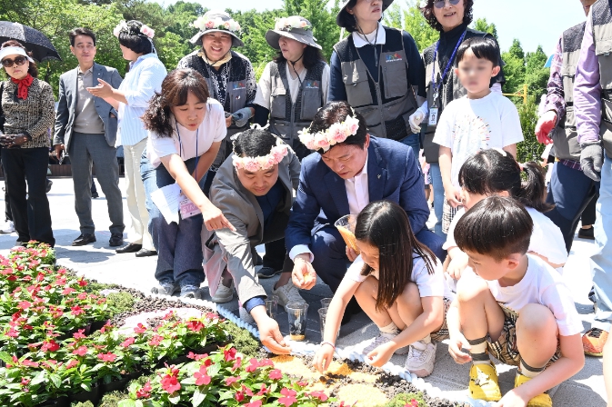 | ▲ 조용익 부천시장과 아이들이 꽃길을 만들고 있다 |