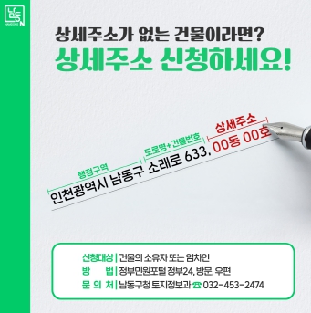 박종효 남동구청장은 “이번 상세주소 부여 신청 접수 기간을 적극 활용해 다가구 주택 등에 거주하는 구민들의 주소정보를 기본으로 하는 행정 및 민간 서비스를 구민들이 좀 더 편하게 받을 수 있기를 기대한다”라고 전했다.