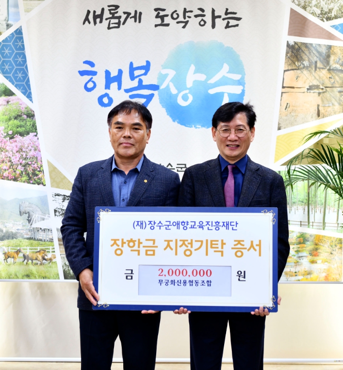 [뉴스서울] 장계 무궁화 신용협동조합이 28일 지역교육 발전과 인재 양성을 위해 2백만원의 장학금을 (재)장수군애향교육진흥재단에 기탁했다.