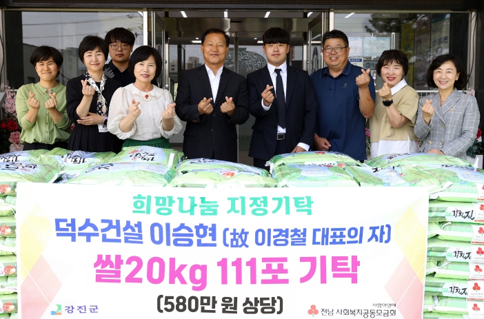 [뉴스서울] 덕수건설 故 이경철 대표의 장남 이승현씨가 지난 21일 580만원 상당의 백미 20kg 111포를 강진군에 어려운 이웃에게 전달해달라고 기탁했다.
