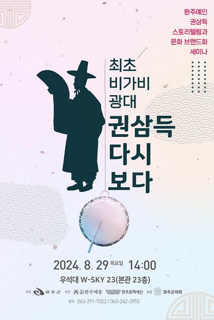 [뉴스서울] 완주군과 완주예총, 완주문화재단이 함께‘최초 비가비 광대 권삼득 다시 보다’세미나를 오는 29일 오후 2시, 우석대학교 본관 23층 완주․우석전망대에서 개최한다.